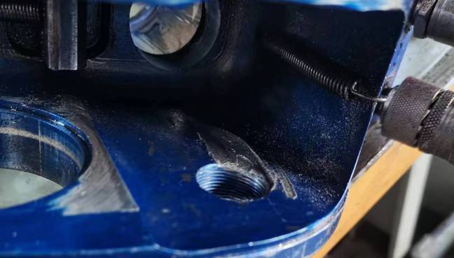 我們拆解檢查發(fā)現(xiàn),改扳手的兩側(cè)驅(qū)動(dòng)板在同一位置發(fā)生斷裂,油缸外沿刮擦缺損嚴(yán)重,殼體內(nèi)腔出現(xiàn)嚴(yán)重刮削凹痕,整個(gè)扳手內(nèi)部充滿金屬碎屑。從各部位損傷跡象我們可以推導(dǎo)出最先出現(xiàn)問題的應(yīng)該是驅(qū)動(dòng)板。長期高負(fù)荷運(yùn)行或者使用過程中的受力不均導(dǎo)致液壓扳手驅(qū)動(dòng)板出現(xiàn)損傷,但彼時(shí)并沒有達(dá)到非常嚴(yán)重的斷裂,扳手有些微卡但依然能夠轉(zhuǎn)動(dòng)使用,導(dǎo)致操作人員沒有及時(shí)發(fā)現(xiàn)和處理。但這個(gè)時(shí)候裂痕使得驅(qū)動(dòng)板不再光滑,并與殼體及油缸外沿產(chǎn)生接觸和刮削嚴(yán)重?fù)p傷了油缸和殼體。同時(shí),刮擦下來的金屬碎屑又在運(yùn)動(dòng)中進(jìn)入棘輪棘爪,對棘輪棘爪也造成了不小傷害。本來只用更換驅(qū)動(dòng)板,卻差點(diǎn)毀了整個(gè)扳手。