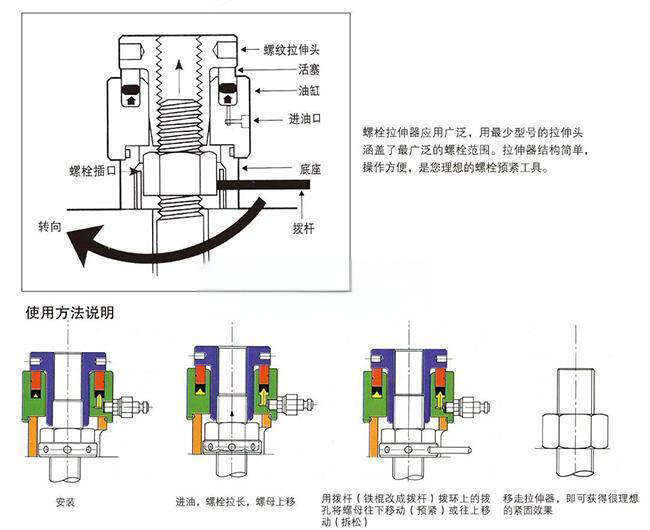 液壓螺栓拉伸器的工作原理可以簡單概括為:電動油泵輸出的高壓油通過高壓軟管輸送到液壓油缸。在高壓油的作用下,液壓缸產(chǎn)生拉伸力,并作用于被預緊的螺栓上。隨著活塞桿的繼續(xù)運動,螺栓被拉伸到一定長度,然后擰緊螺母,再松卸螺栓,完成螺栓的預緊工作。液壓螺栓拉伸器通過直接對螺栓施加軸向拉力,使螺母與法蘭面之間產(chǎn)生間隙,從而用較小的力將螺母旋緊。在釋放拉伸力時,雖然會有一定的載荷損失,但通過規(guī)范操作和經(jīng)驗積累,可以很好地控制這種損失,確保預緊力的準確性。