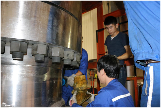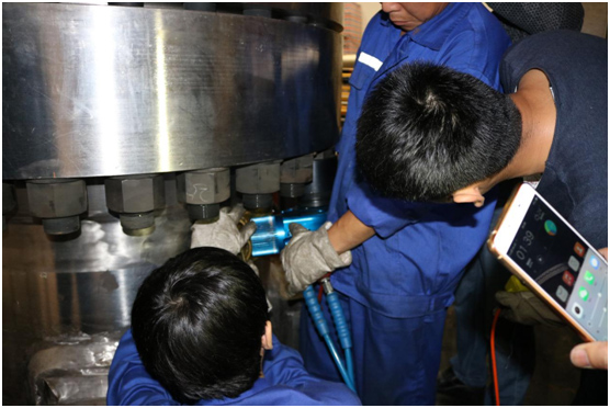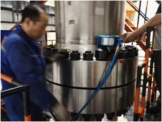 現(xiàn)場(chǎng)工作人員非常認(rèn)真地與波霆機(jī)械工程師進(jìn)行交流、探討以及學(xué)習(xí)液壓扳手的正確操作方法。培訓(xùn)剛剛結(jié)束大家就開始忙碌起來,對(duì)應(yīng)兩個(gè)法蘭現(xiàn)場(chǎng)工人分成兩組,每組三個(gè)人,采用兩同步拆卸螺栓。