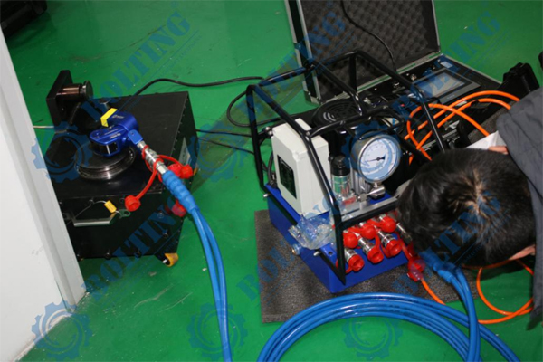 液壓扭力扳手第三方扭矩校驗(yàn)檢測,理論上液壓扭力扳手檢測標(biāo)定與液壓泵的型號和流量無關(guān),液壓扭力扳手泵經(jīng)過校正壓力表,均可對液壓扭力扳手進(jìn)行檢測,經(jīng)過長期及大量的實(shí)踐證明,液壓泵的流量與扭矩大小息息相關(guān),舉例說明,BOLTING博霆PE55液壓扭力扳手泵和BOLTING博霆PE110液壓扭力扳手泵,采用同一塊經(jīng)過校驗(yàn)壓力表,分先后順序緊固一顆螺栓,由PE55液壓扭力扳手泵配套液壓扭力扳手先進(jìn)行緊固,達(dá)到設(shè)定壓力后(300bar),擰不動了,換PE110液壓扭力扳手泵,壓力同樣設(shè)定300bar,壓力相同,螺栓同樣可以轉(zhuǎn)動,反之,采用PE55液壓扭力扳手泵,配合此扳手,壓力設(shè)定到300bar,確無法松動螺栓,配PE110液壓扭力扳手泵可輕松拆卸此螺栓,得出結(jié)論,液壓扭力扳手在工作過程中,需克服摩擦力,雖然液壓扭力扳手無沖擊性,但流量決定可以克服多少摩擦力,液壓扭力扳手怎樣檢測更精準(zhǔn)?市場上部分廠家流量與扭矩存在虛標(biāo)成分(電動液壓泵流量檢測最簡單方式,可采用單向閥裝置連接液壓油管,將液壓泵調(diào)整至所需檢測的壓力流量,每分鐘溢出的油量則是液壓泵流量,測流量裝置BOLTING博霆有售),計(jì)量院或第三方檢測機(jī)構(gòu)所采用的液壓泵型號不盡相同,采用購買液壓扭力扳手配套的電動液壓扭力扳手泵,配套進(jìn)行檢測更為精確。