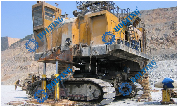 在更換如履帶行走裝置、旋轉裝置等部件,就需要將整機同步頂升,平穩(wěn)的頂起到一定的高度,才方便現(xiàn)場的檢修,那如何保證不損壞整機結構,又能使其均衡受力,針對此類問題,我公司技術團隊對其進行系統(tǒng)化的受力分析,推薦我公司PLC控制同步頂升液壓系統(tǒng)進行4點位變頻控制,目的是將大型電鏟進行受力局部分布在4個受力點上,采用400噸行程1800mm的大行程液壓千斤頂支撐,通過對4臺千斤頂的位移與壓力的雙閉環(huán)控制,解決現(xiàn)場的位移同步問題與受力均衡問題!